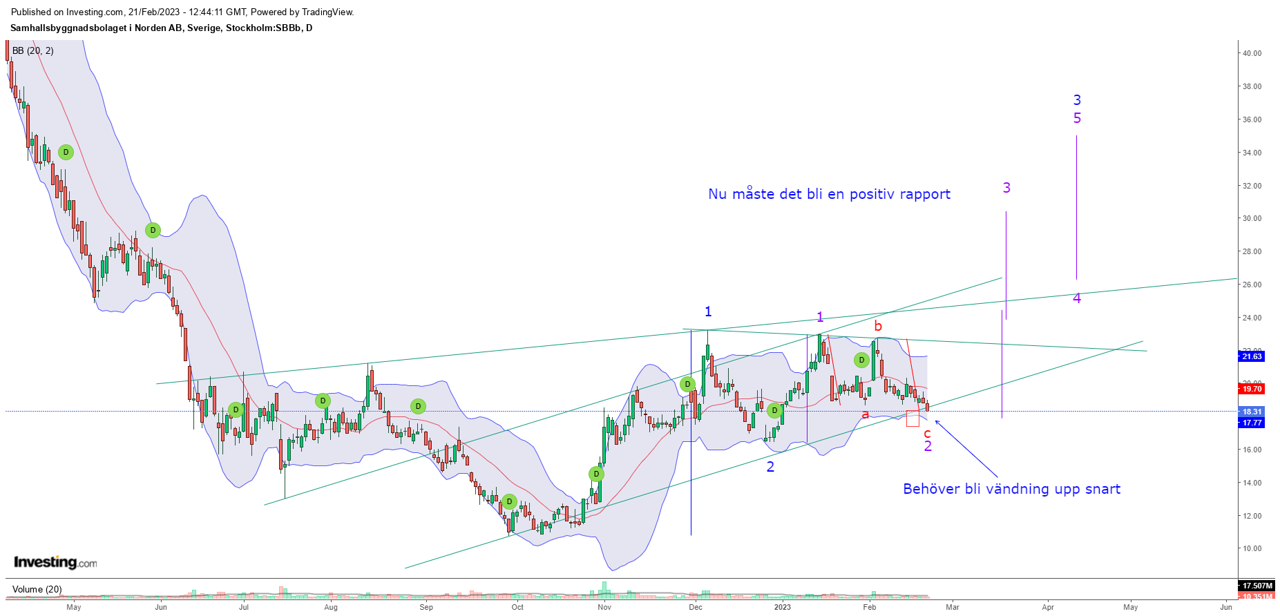 Investerare har över tid stadigt betalt allt högre priser för att köpa in sig i SBB Norden B och aktien ligger i en stigande trendkanal på medellång sikt. Stigande trender indikerar att bolaget är inne i en positiv utveckling och att köpintresset bland investerare ökar. Aktien har brutit upp genom motståndet vid cirka 5.40 kronor. Vidare uppgång är därmed signalerad, och det är nu stöd vid 5.40 kronor vid reaktioner tillbaka. Positiv volymbalans indikerar att köparna är aggressiva medan säljarna är passiva, och förstärker aktien. Det kortsiktiga momentumet i aktien är starkt positivt, med RSI över 70. Det indikerar ökande optimism hos investerarna och ytterligare kursuppgång för SBB Norden B. Aktien är totalt sett tekniskt positiv på medellång sikt."