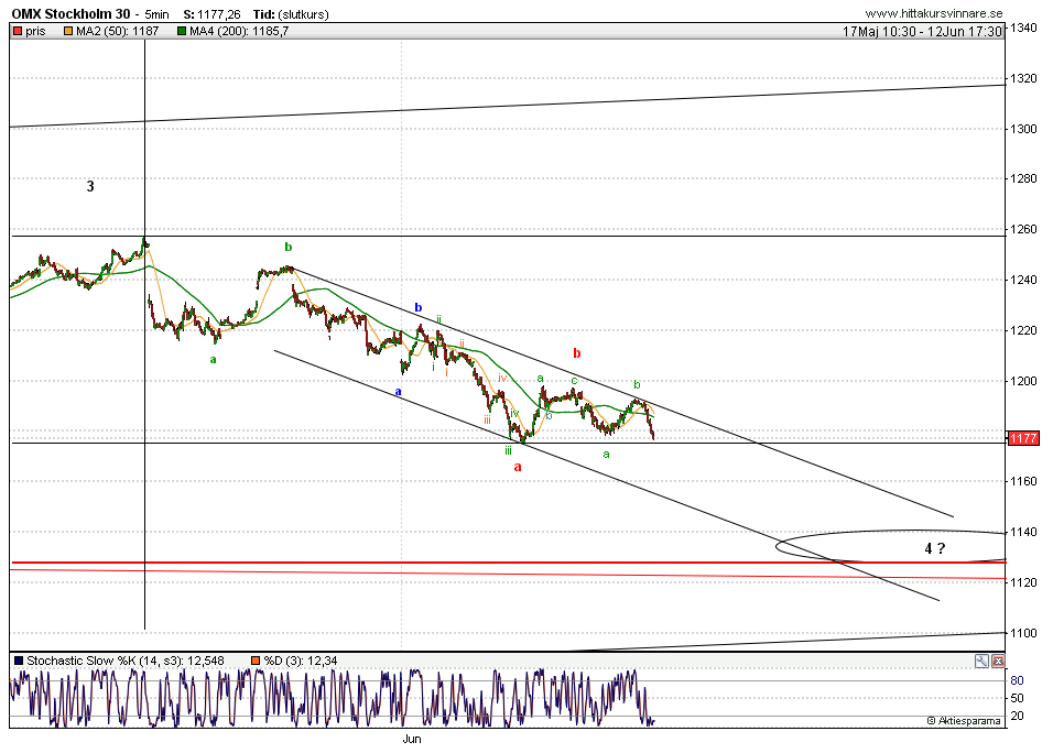 Rekylen liknar mer den något oregelbundna nedgången i höstas än de 5 prydliga vågorna i mars-apr. Positionen nu motsvarar i så fall sista dagarna i okt. Det skulle innebära ett litet lyft nästa vecka och sedan en avslutning ned mot 1140. Även då sammanföll sista droppet med tidigare botten. runt 1030.