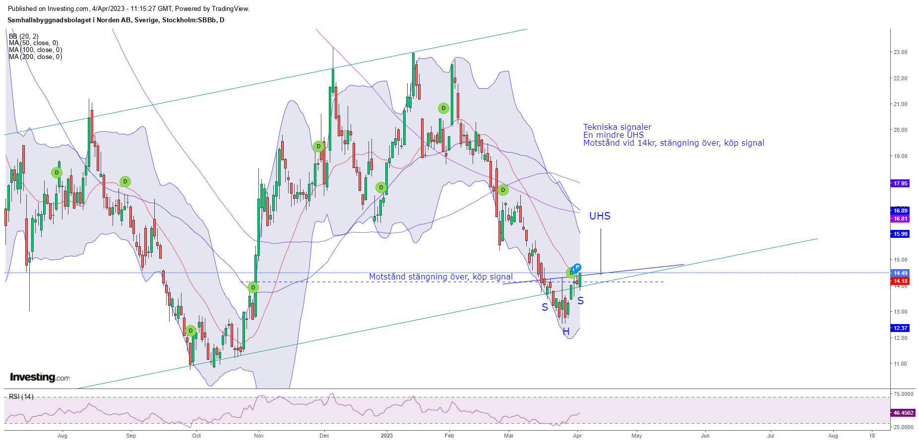 Investerare har över tid stadigt betalt allt högre priser för att köpa in sig i SBB Norden B och aktien ligger i en stigande trendkanal på medellång sikt. Stigande trender indikerar att bolaget är inne i en positiv utveckling och att köpintresset bland investerare ökar. Aktien har brutit upp genom motståndet vid cirka 5.40 kronor. Vidare uppgång är därmed signalerad, och det är nu stöd vid 5.40 kronor vid reaktioner tillbaka. Positiv volymbalans indikerar att köparna är aggressiva medan säljarna är passiva, och förstärker aktien. Det kortsiktiga momentumet i aktien är starkt positivt, med RSI över 70. Det indikerar ökande optimism hos investerarna och ytterligare kursuppgång för SBB Norden B. Aktien är totalt sett tekniskt positiv på medellång sikt."